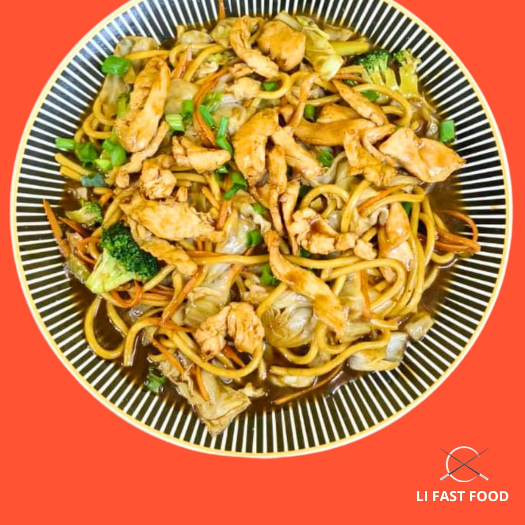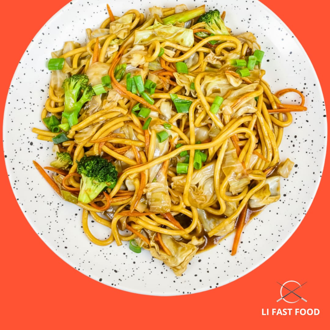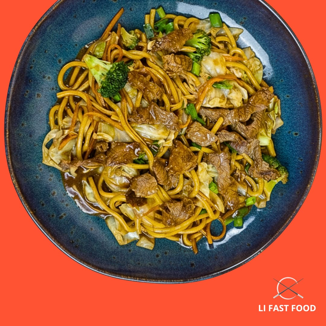 Receita tradicional do Li Fast Food, feita com tiras macias de carne bovina e um mix de legumes frescos – repolho, brócolis, cenoura e cebolinha – salteados no molho shoyu especial da casa.