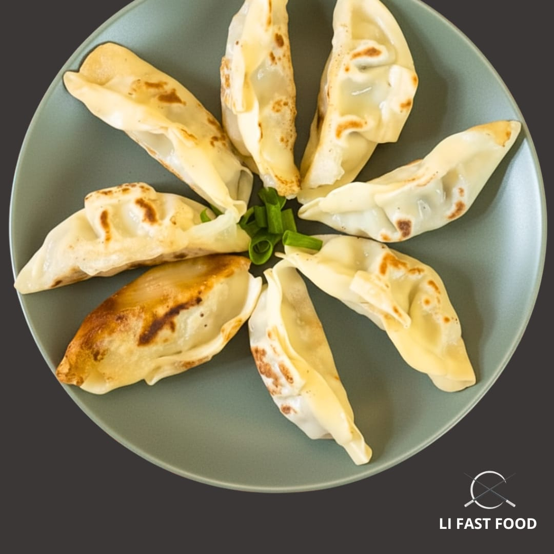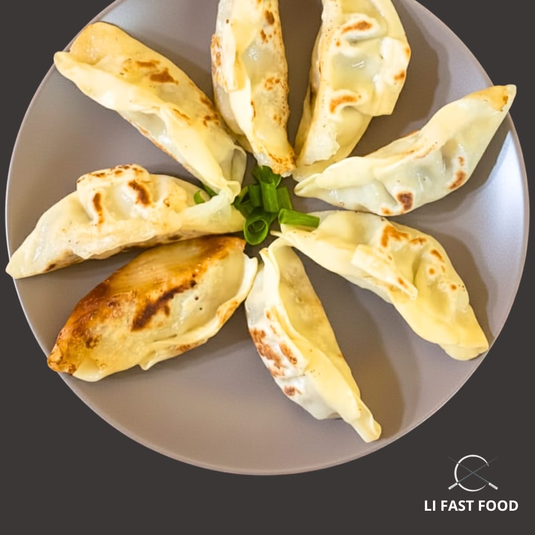 Guioza (gyoza) suína artesanal: bolinho oriental de massa fina e crocante, recheado com carne suína temperada. Sabor marcante da culinária chinesa, perfeita pra quem ama comida oriental e delivery Li Fast Food.