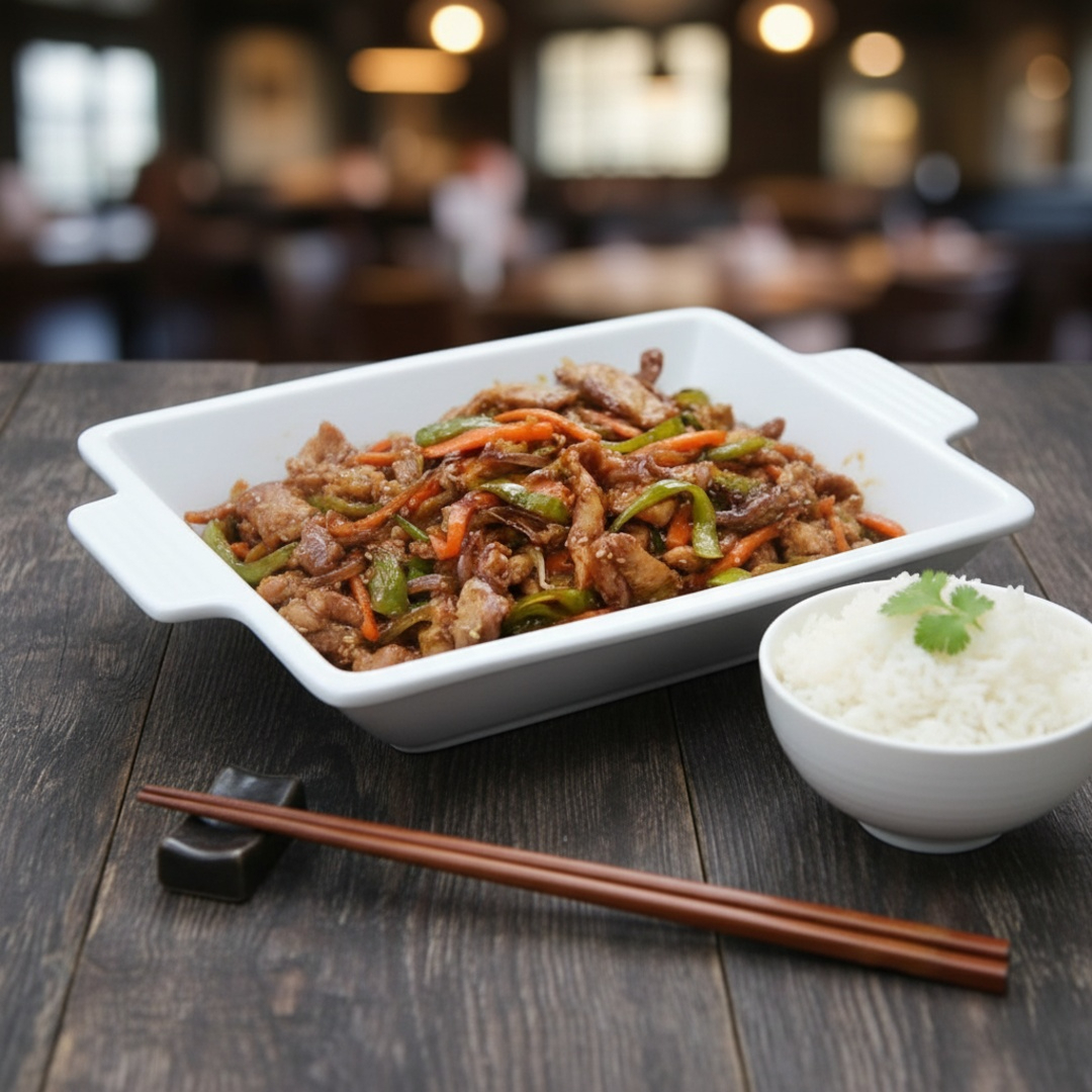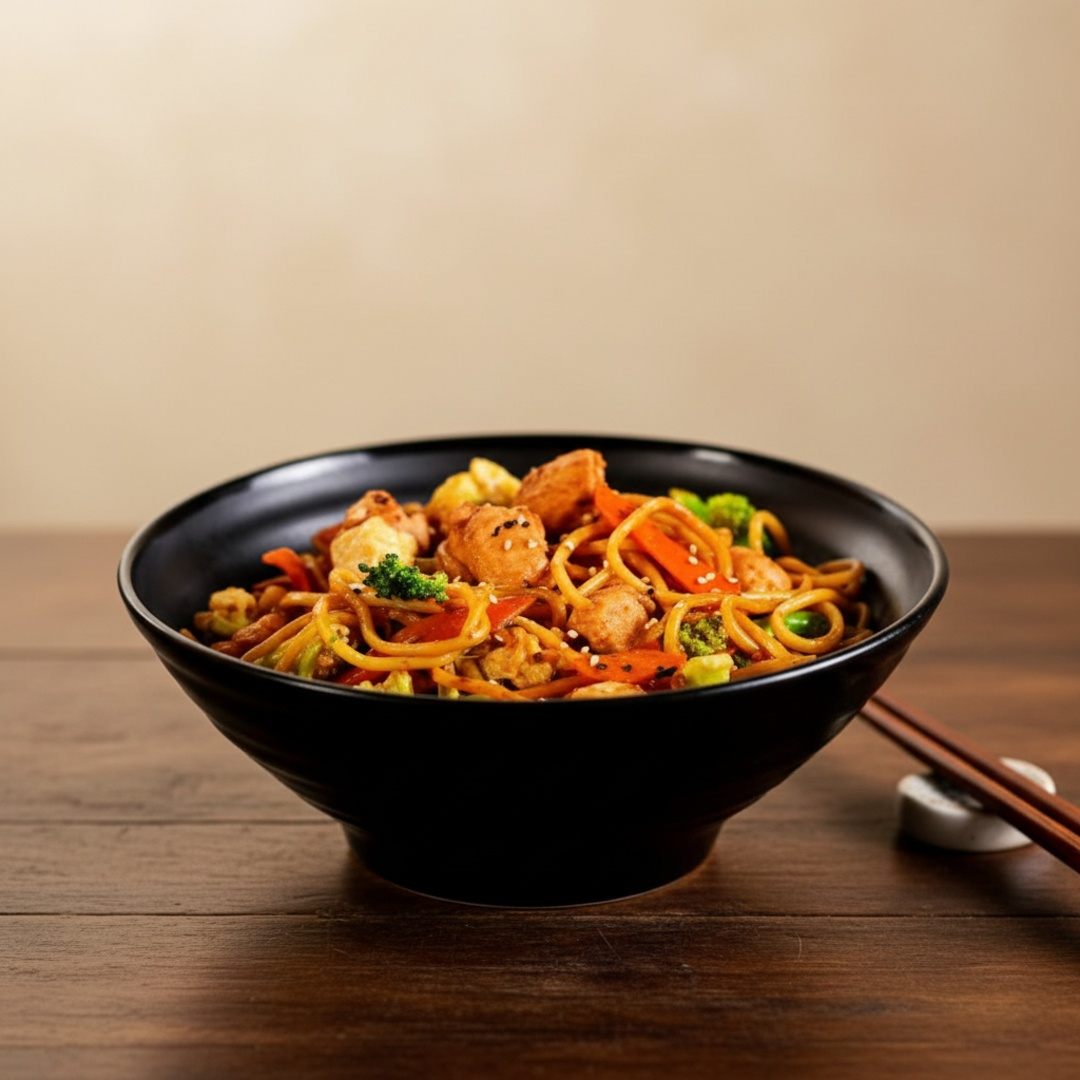 Um yakissoba tradicional e elegante, combinando carnes suculentas e vegetais frescos em um molho saboroso.