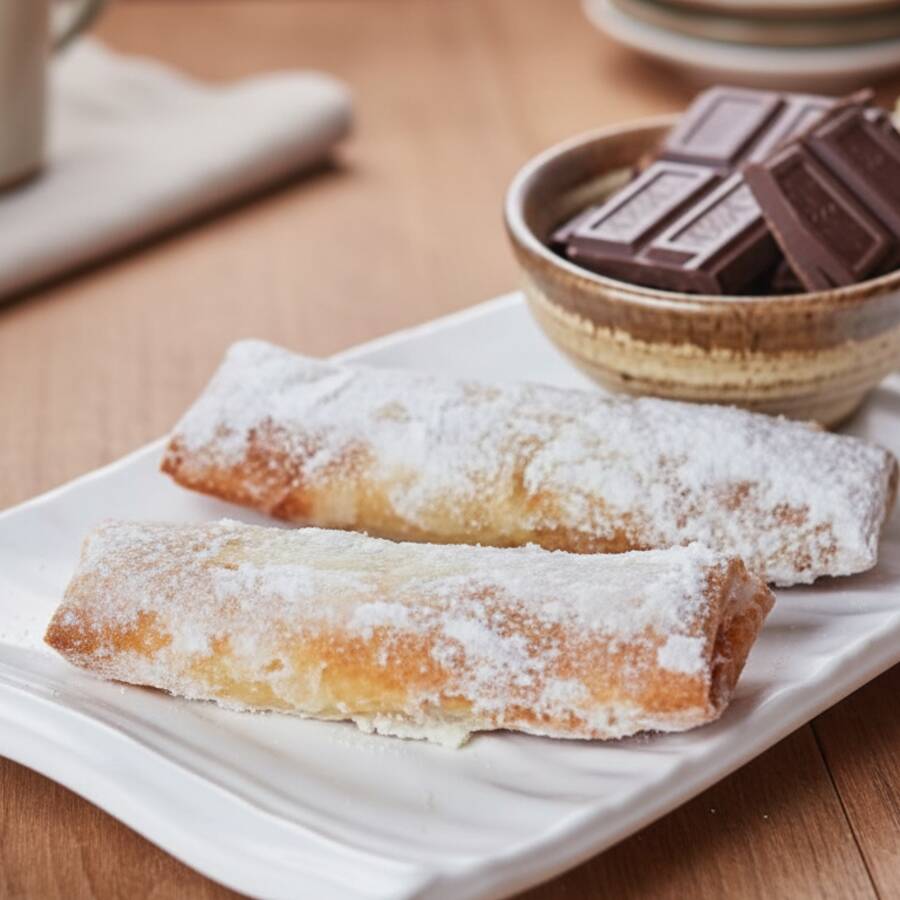 Rolinho primavera ou Harumaki, massa crocante recheado com Banana e Chocolate. Polvilhado com açúcar.