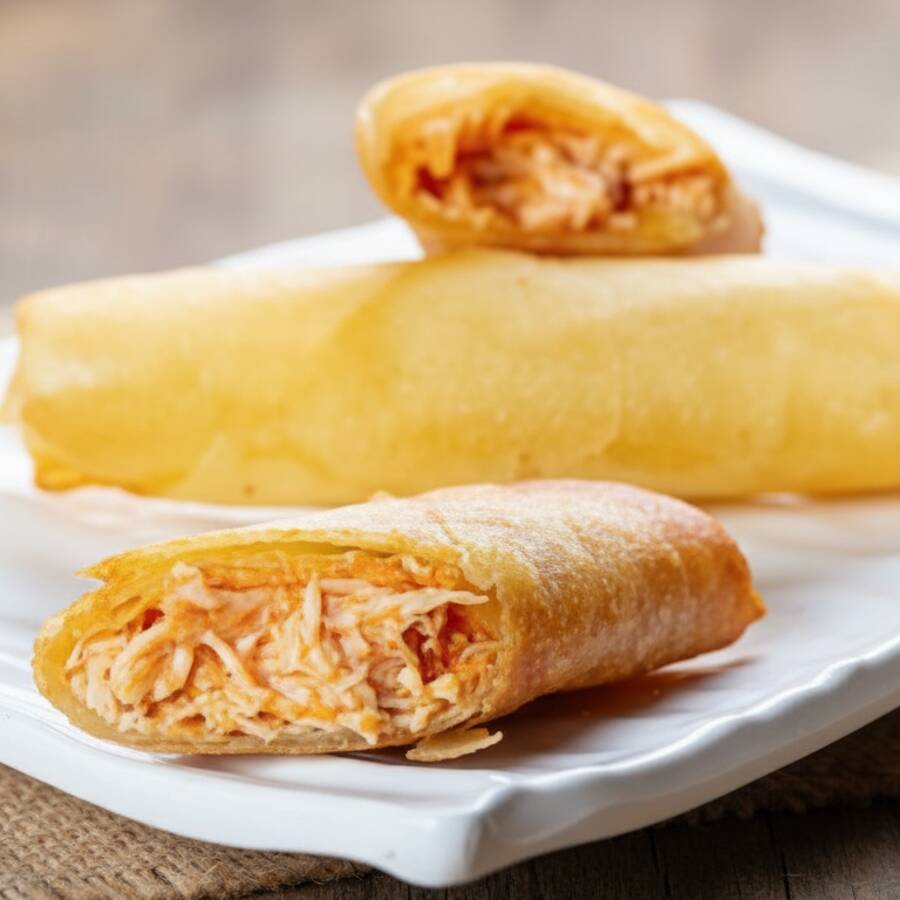 Rolinho primavera ou Harumaki, massa crocante recheado com frango desfiado e temperado com Catupiry .
