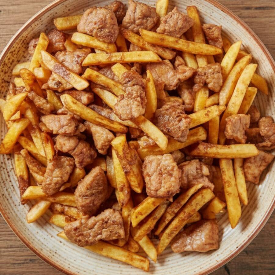 Carne bovina fatiada com batatas fritas, envolvidos no clássico molho do Lig-Lig. Preparado no wok chinês de forma artesanal com ingredientes frescos.