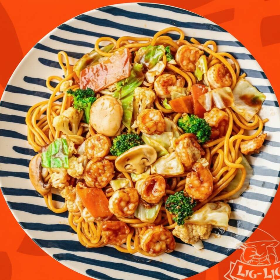Macarrão sobá frito no wok com camarão, carne bovina, frango, couve-flor, brócolis, cogumelos, repolho e cenoura com o clássico molho do Lig-Lig. Preparado no wok chinês de forma artesanal com ingredientes frescos.