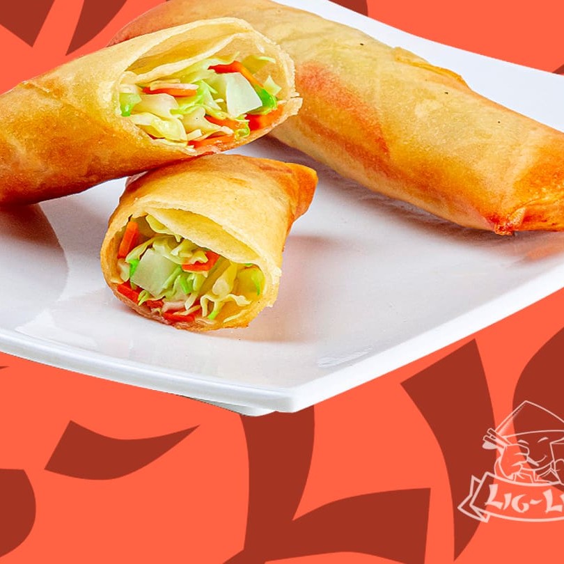 Rolinho primavera ou Harumaki, massa crocante recheado com tiras de repolho, cenoura e cebolinha. Acompanha sachê de molho agridoce.