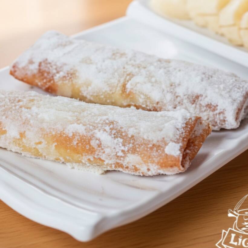 Rolinho primavera ou Harumaki, massa crocante recheado com Banana e canela. Polvilhado com açúcar.