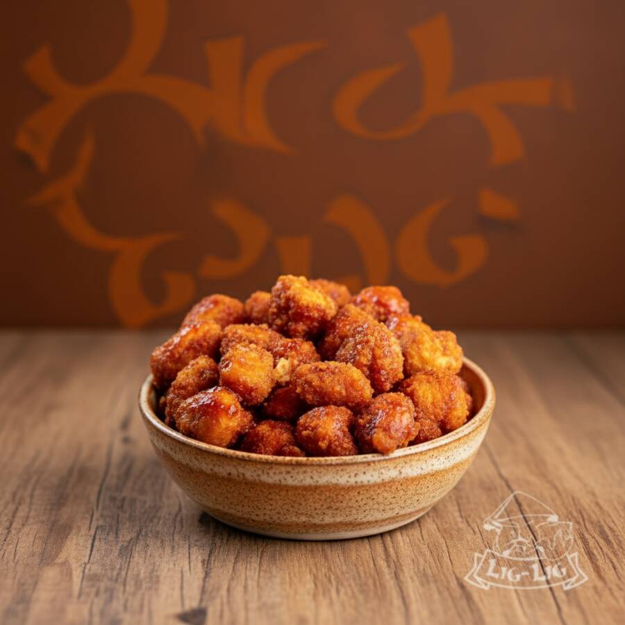 Cubos suculentos de frango combinados com pimentões, cebolas, envolvidos com o clássico molho do Lig-Lig finalizados com amendoim. Preparado no wok chinês de forma artesanal com ingredientes frescos.