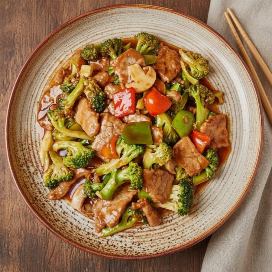 Carne bovina fatiada com brócolis, pimentões verdes e vermelhos e cogumelos, envolvidos no clássico molho do Lig-Lig. Preparado no wok chinês de forma artesanal com ingredientes frescos.