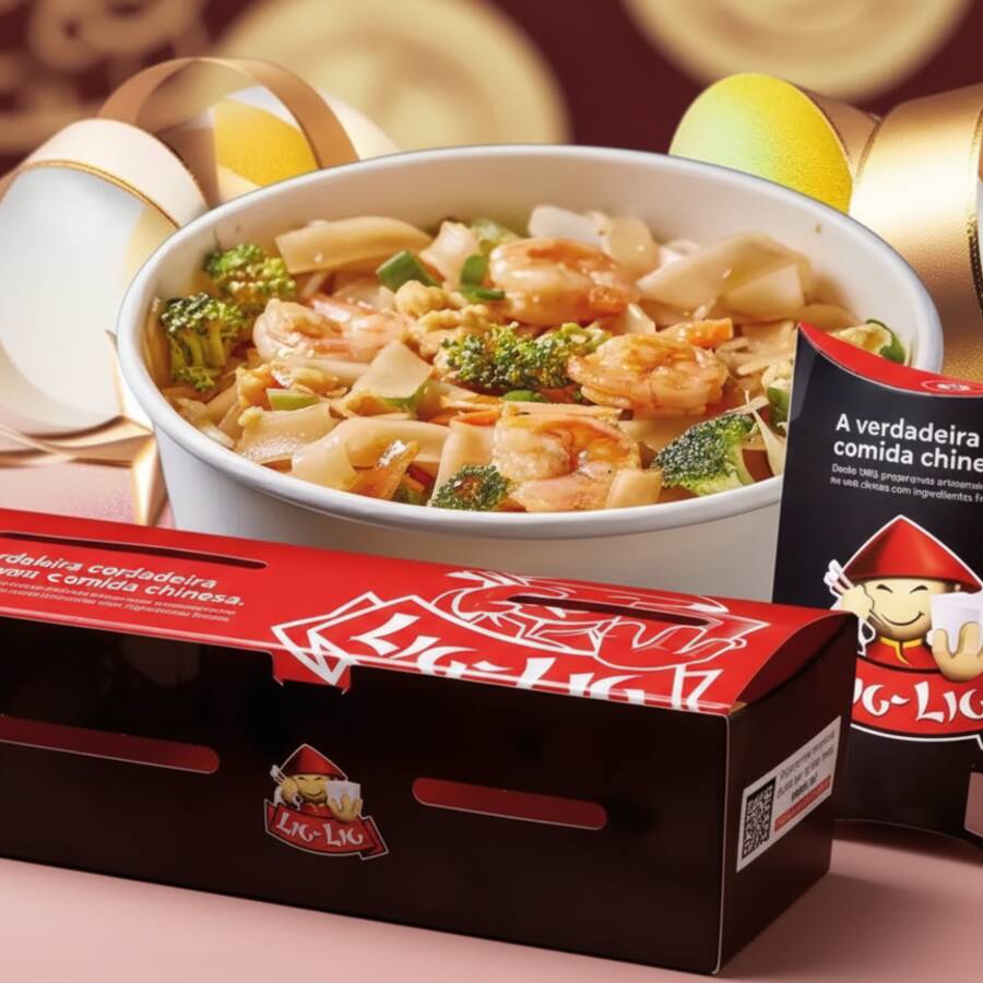 Macarrão sobá frito no wok com camarão, carne bovina, frango, couve-flor, brócolis, cogumelos, repolho e cenoura com o clássico molho do Lig-Lig. Preparado no wok chinês de forma artesanal com ingredientes frescos.