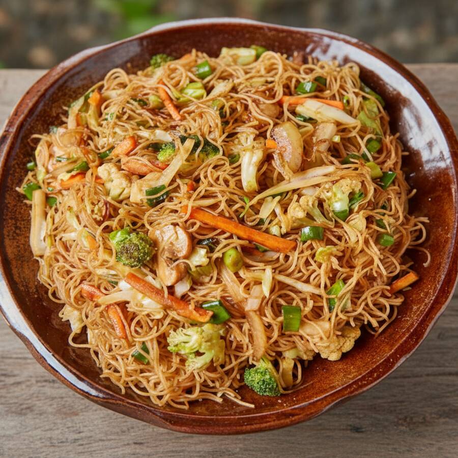 (Vegetariano) Macarrão de arroz ao molho shoyu com brócolis, couve-flor, cenoura, cebola, repolho, pimentões, cogumelo e cebolinha. Preparado no wok chinês de forma artesanal com ingredientes frescos.