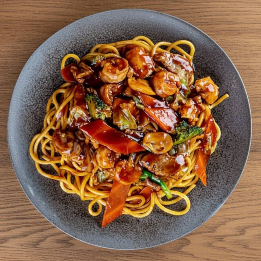 Macarrão de arroz ao molho shoyu com tiras de carne bovina, lombo, frango, brócolis, couve-flor, cenoura, cebola, repolho, pimentões, cogumelo e cebolinha. Preparado no wok chinês de forma artesanal com ingredientes frescos.