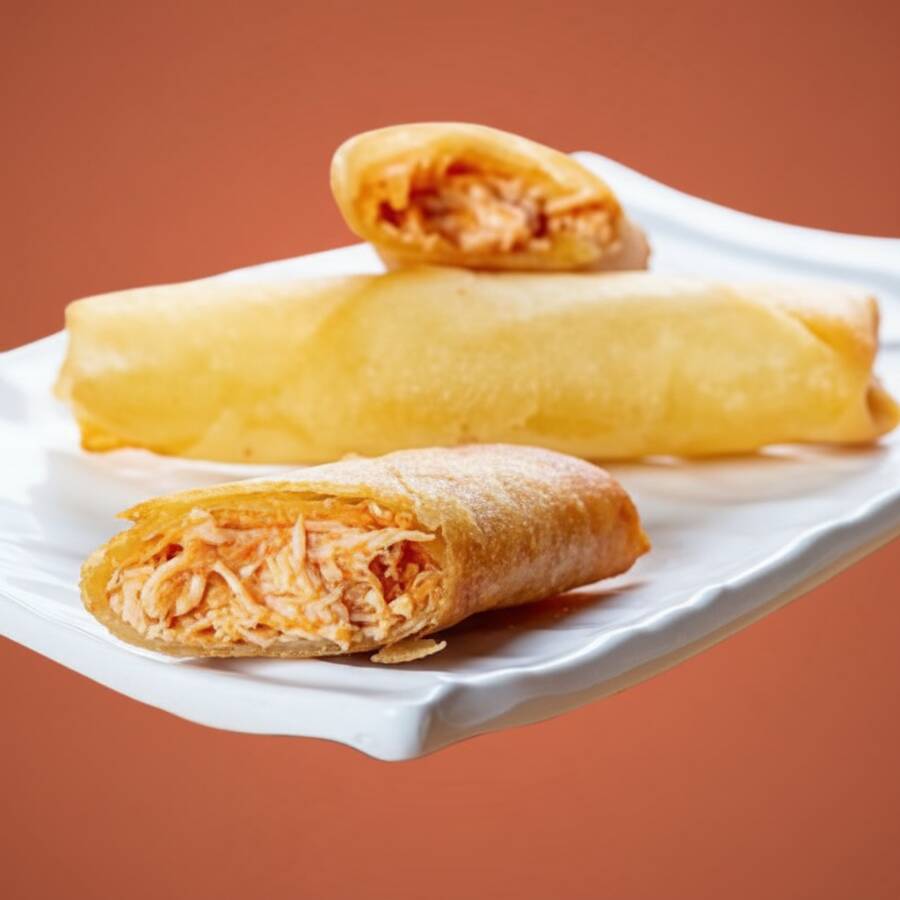 Rolinho primavera ou Harumaki, massa crocante recheado com frango desfiado e temperado com Catupiry .