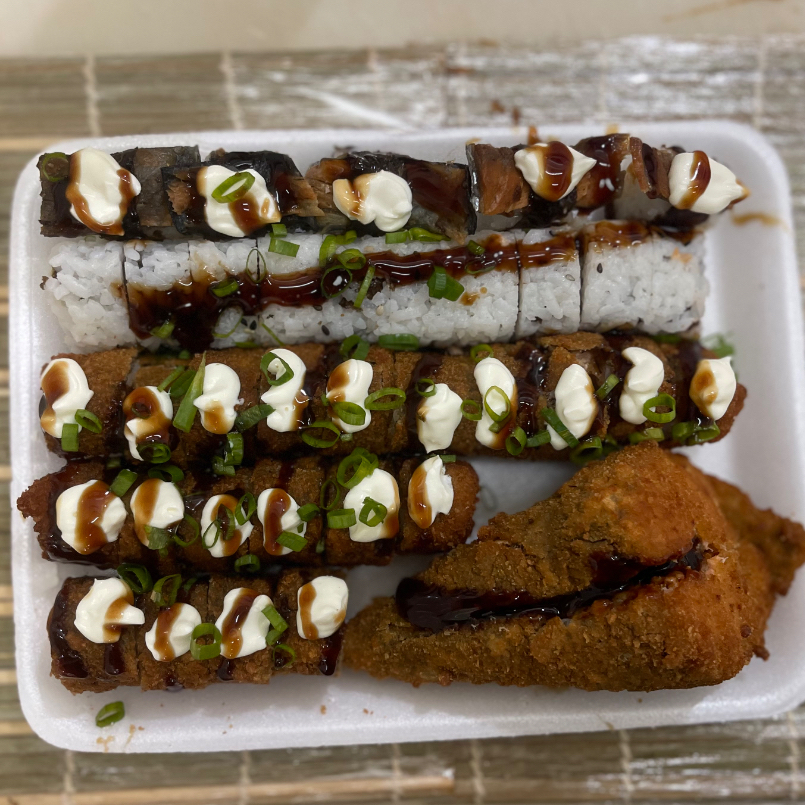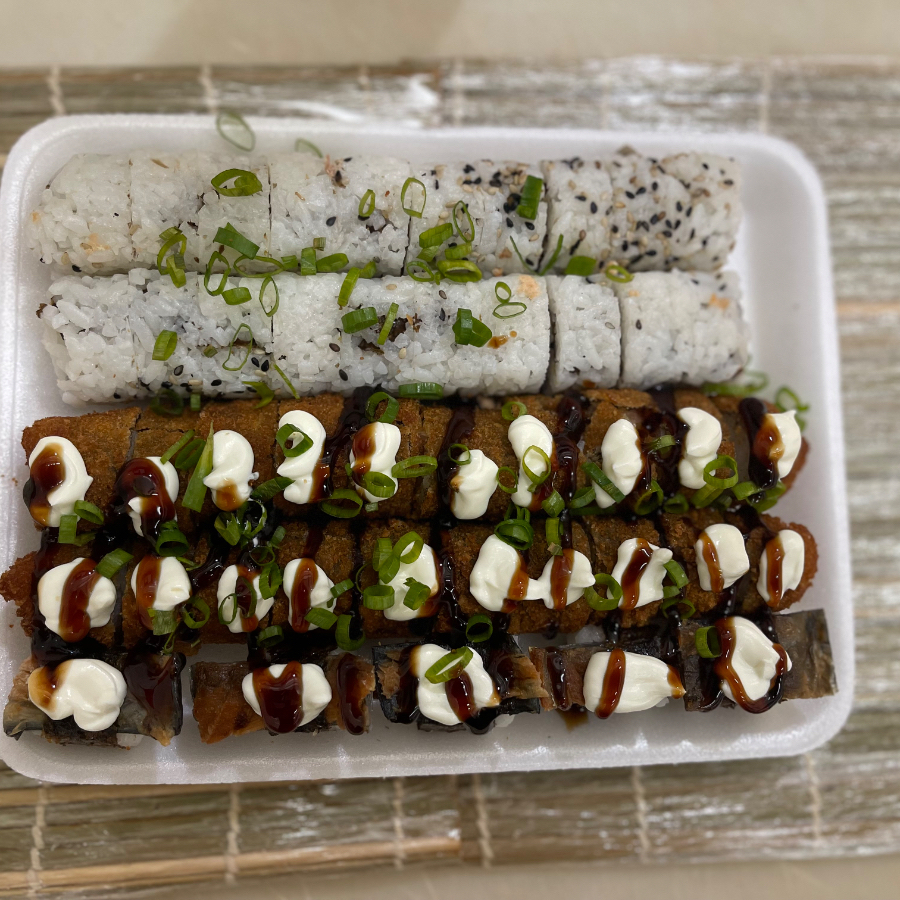 deliciosos suhsi feito com alga marinha arroz japones e salmao grelhado empanado e frito pra finalizar crem chease e molho tare por cima
