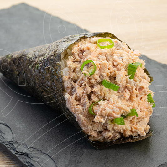 DELICIOSO TEMAKI FEITO COM SALMAO GRELHADO ALGA MARINHA E ARROZ JAPONES