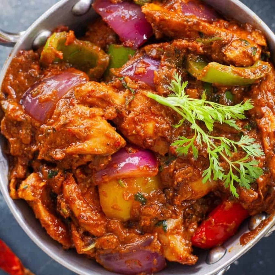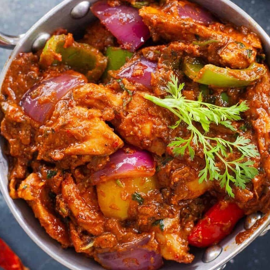Um prato tradicional do norte da Índia feito com pedaços suculentos de frango cozidos em um molho espesso e aromático. Feito com uma mistura de especiarias indianas, pimentões, cebolas e tomates frescos, este prato é finalizado com coentro e gengibre para um sabor rico e autêntico. Servido quente, é perfeito com arroz naan ou basmati.