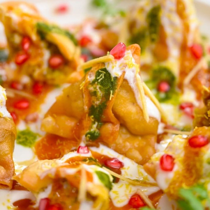 Uma combinação irresistível de samosas crocantes, quebradas e cobertas com grão-de-bico temperado, chutney de tamarindo doce e picante, chutney de hortelã com coentro e iogurte cremoso. Finalizada com cebolas frescas, tomates, coentro e uma pitada de especiarias indianas, essa explosão de sabores e texturas é perfeita para quem busca uma experiência autêntica e deliciosa da culinária de rua indian
