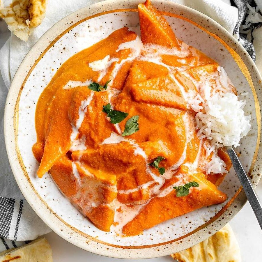 Butter Chicken: Frango marinando em especiarias e iogurte, cozido em um molho rico e cremoso de tomate e manteiga, oferecendo uma combinação irresistível de sabores suaves e intenso.