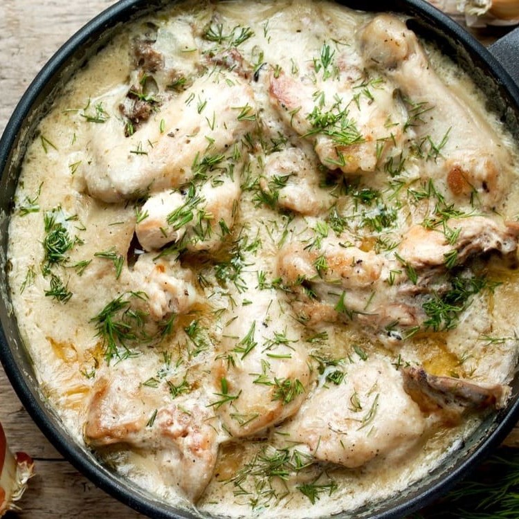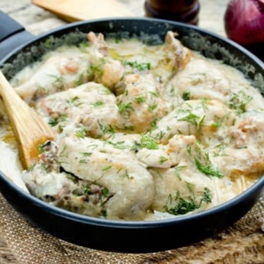 Suaves pedaços de frango sem osso marinados em creme fresco e especiarias aromáticas. Este prato oferece um equilíbrio delicado entre o sabor defumado e a textura cremosa.