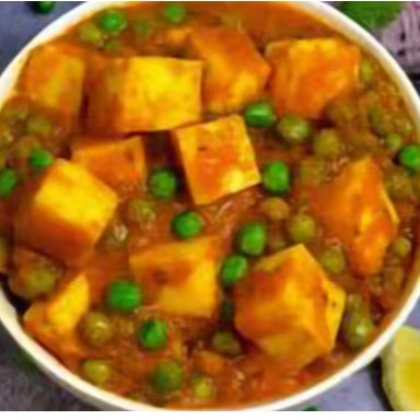 Matar Paneer: Cubos de queijo indiano (paneer) e ervilhas cozidos em um molho de tomate temperado com especiarias tradicionais, criando uma combinação equilibrada e saborosa.