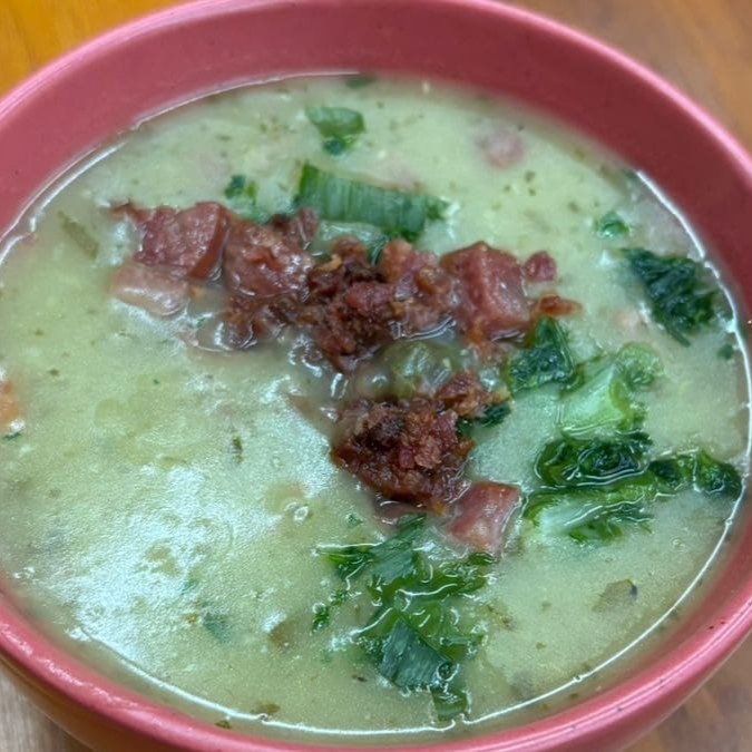 Caldo verde acompanha bacon frito, farofa e pão francês.