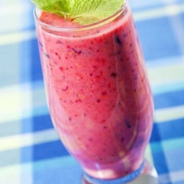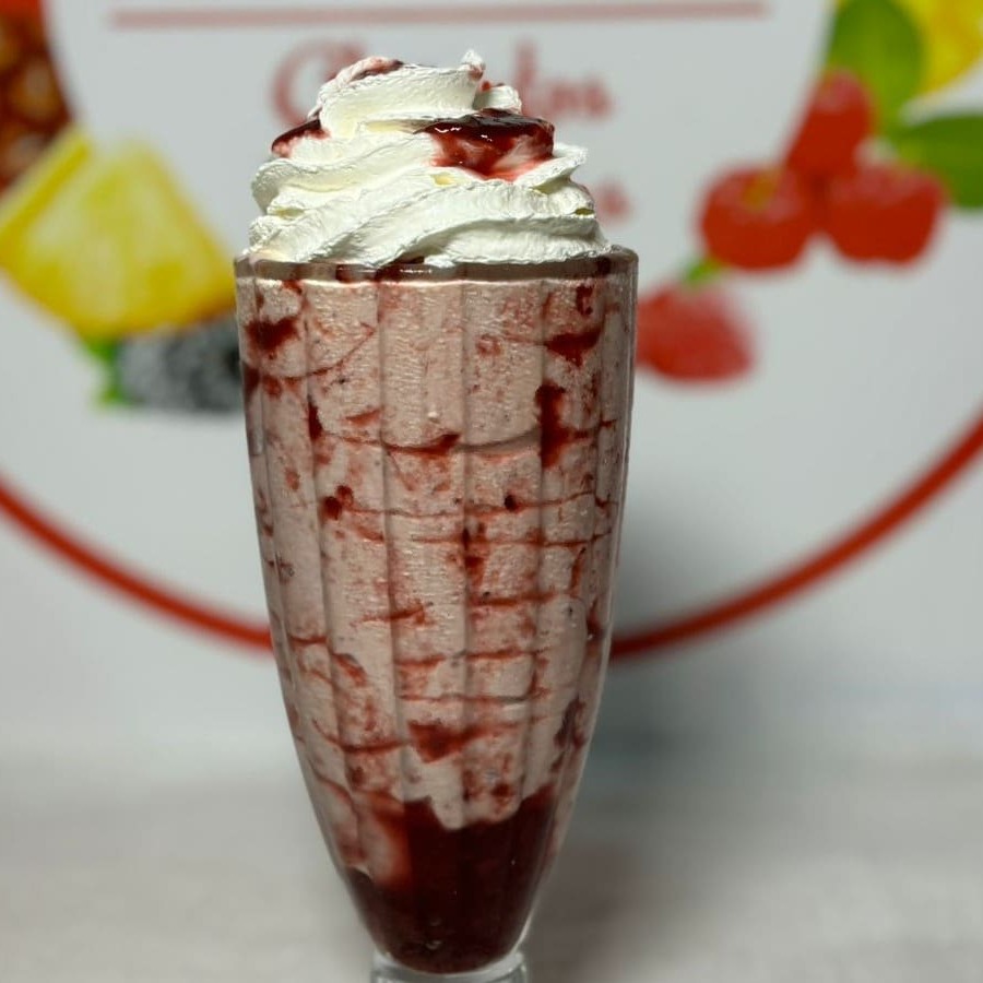 Nosso delicioso milkshake de frutas vermelhas é feito com sorvete de creme e uma saborosa geleia de frutas vermelhas naturais.