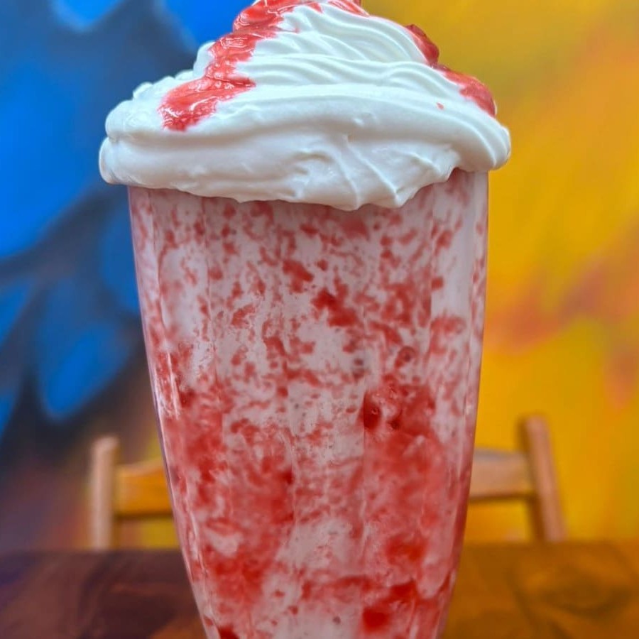 Nosso delicioso milkshake de morango, feito com sorvete sabor morango e com calda de morango.