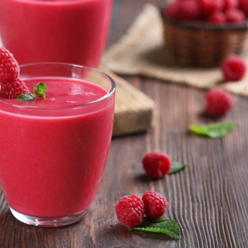 Nosso delicioso milkshake de framboesa é feito com sorvete de creme e uma saborosa calda de framboesa natural.