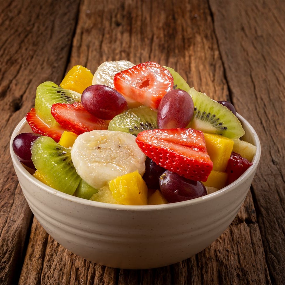 Salada de frutas com morango, banana, manga, abacaxi, melão, uva e mamão.