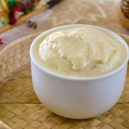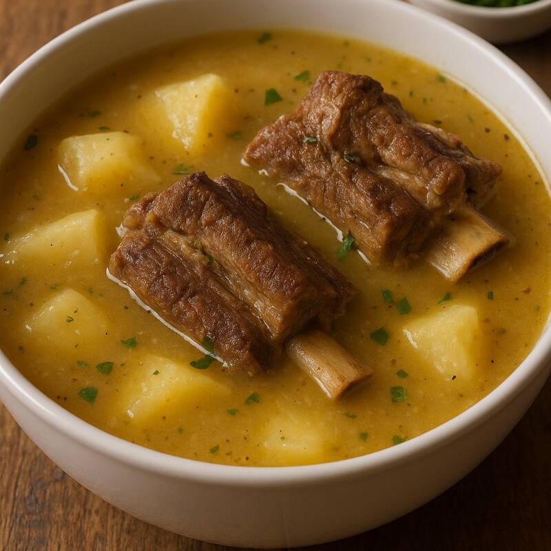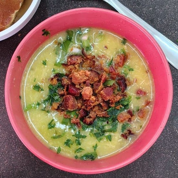 Caldo de mandioca com costela, acompanha bacon frito, queijo parmesão ralado e pão francês.