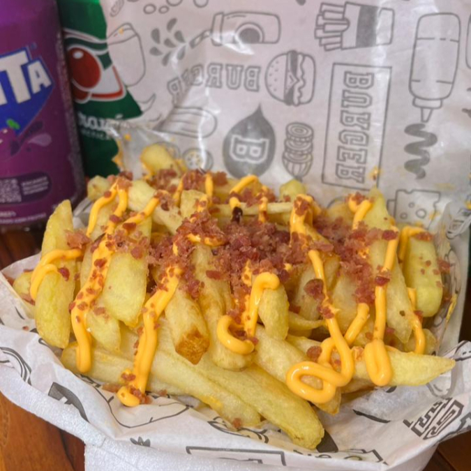 Batata frita grande com nosso delicioso cheddar e bacon picado.