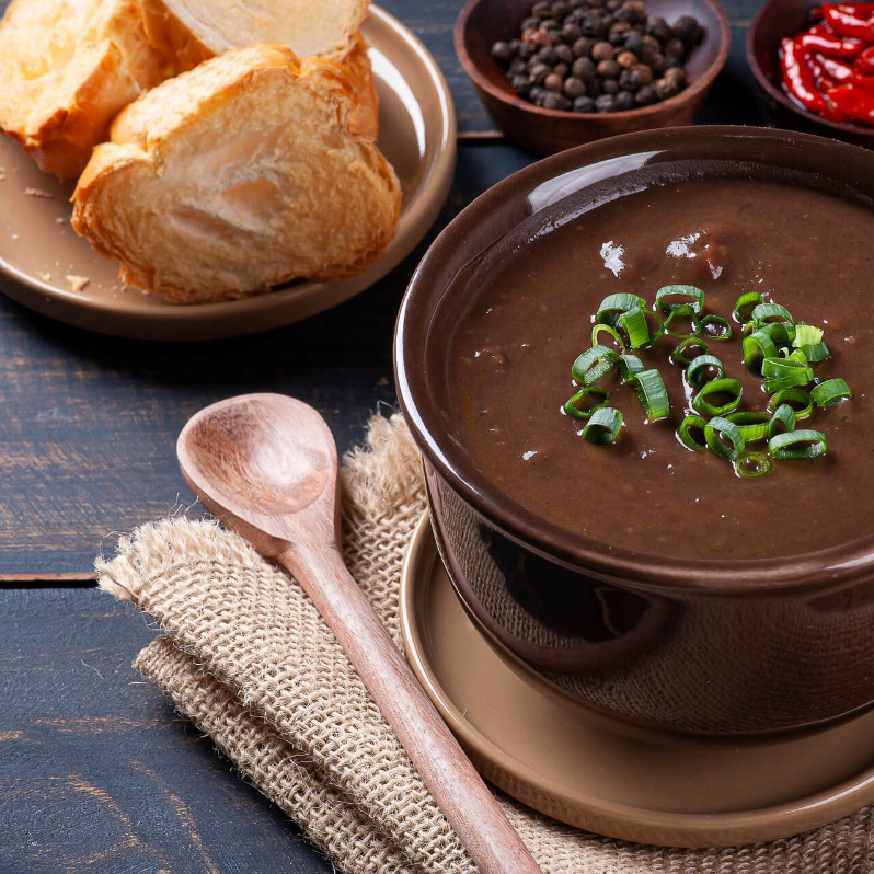 Nosso delicioso caldo de feijoadinha, acompanha bacon e couve refogado.