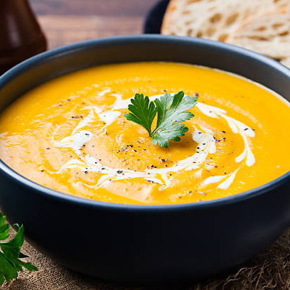 Caldo de abobora com carne seca, acompanha farofa com bacon e pão francês.