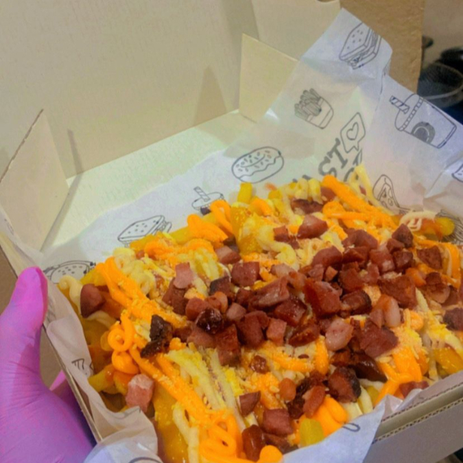 batata frita, catchup, catupiry, cheddar e calabresa