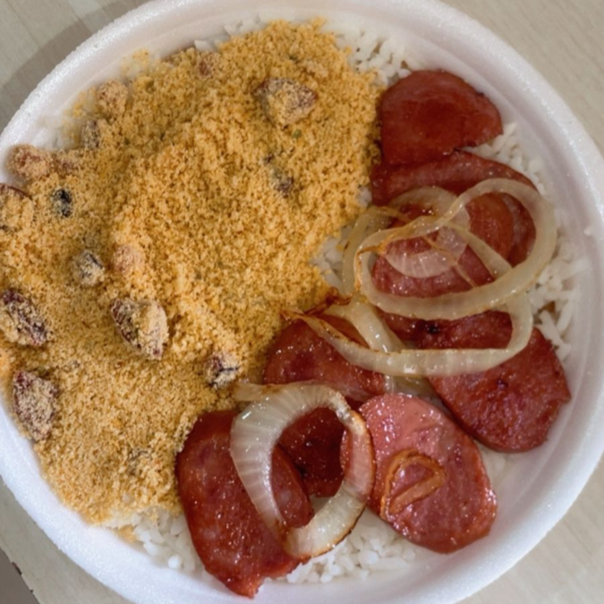 Marmita tamanho pequena feita com feijão carioca , arroz branco , Calabresa acebolada e 1 acompanhamento de sua escolha