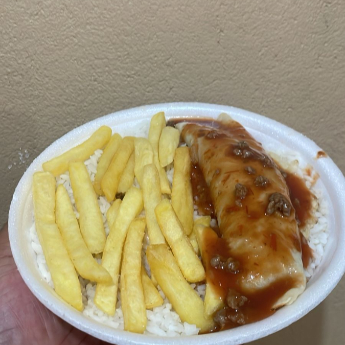 Marmita tamanho Grande feita com feijão carioca , arroz branco , file de frango e 1 acompanhamento de sua escolha