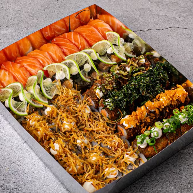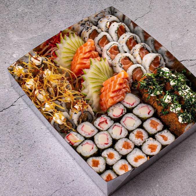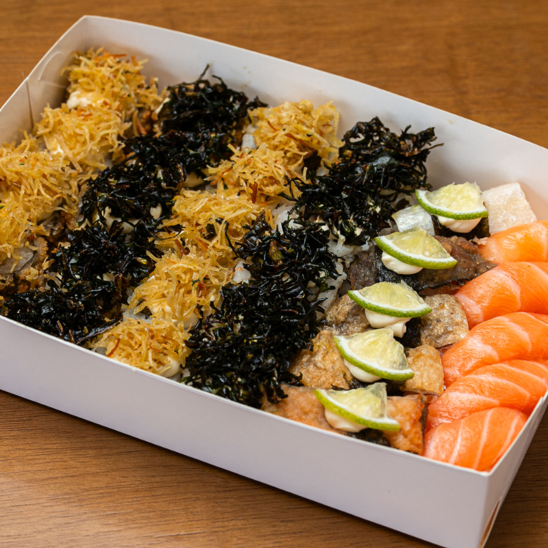10 hossomaki de salmão / 10 hossomaki pepino/ 10 uramaki skin couve crispy/ 5 Uramaki Skin batat crispy / 5 uramaki california/ 10 Kapamaki / 30 Hot Roll. 1 Coca-Cola 350ml.