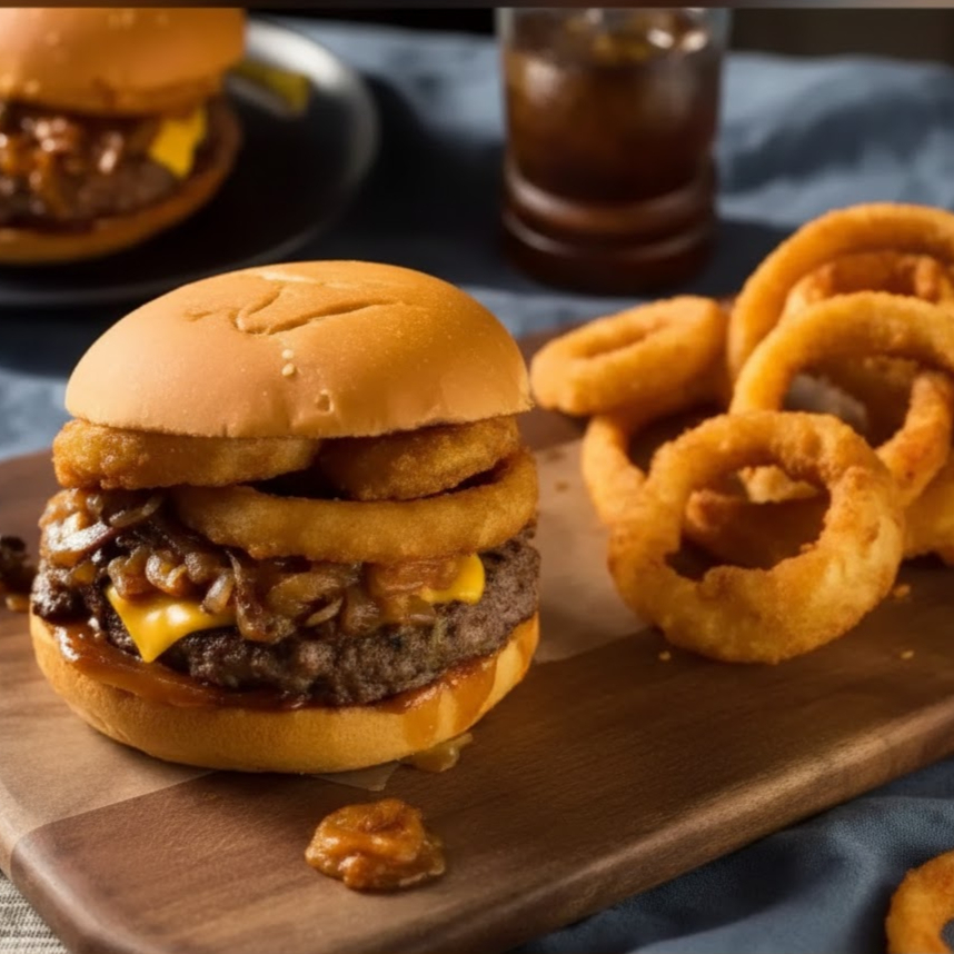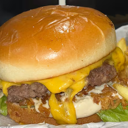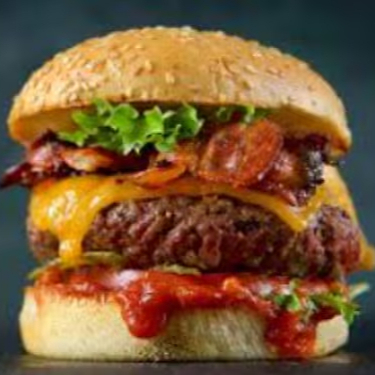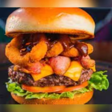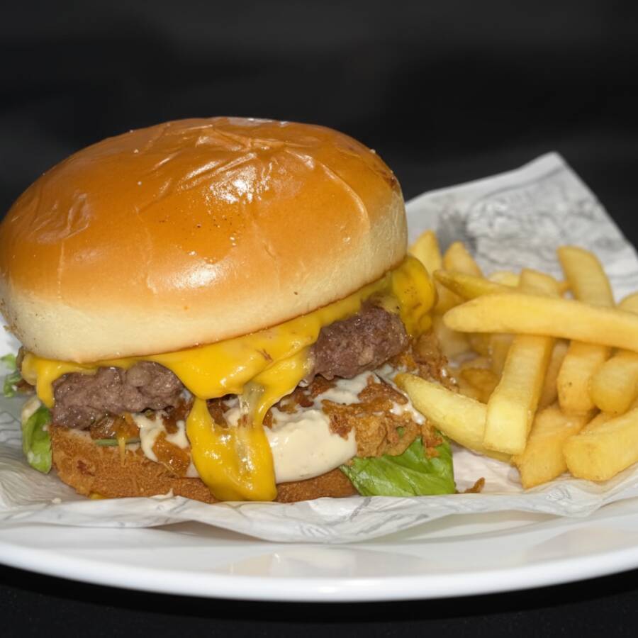 Pão de brioche, dois hamburgueres artesanal 120g, onion cheddar, bacon, ovo, maionese da casa, alface americano, rodelas de tomate.