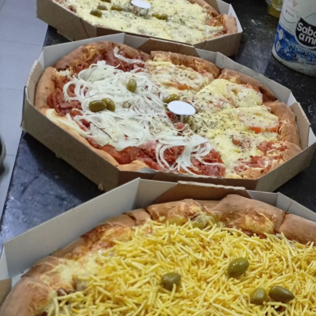 2 portuguesa, 2 frango catupiry, 2calabresa com catupiry, 2 queijo e bacon, 2 dois queijos.