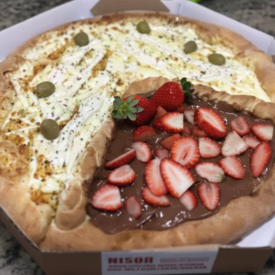 Pizza Rodizio. 3 Sabores Em Única Pizza. Frango Catupiry, Dois Queijos, Morango E Chocolate.
