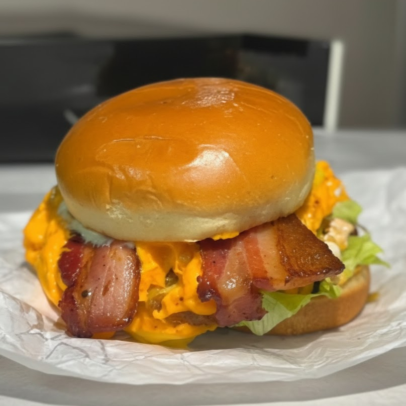 Pão de brioche, hamburguer artesanal 120g, cebola caramelizada, bacon, cheddar, molho especial, alface e rodelas de tomate.