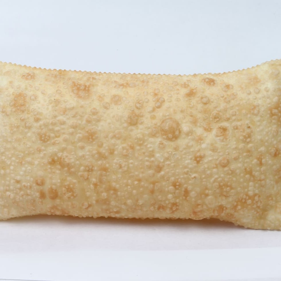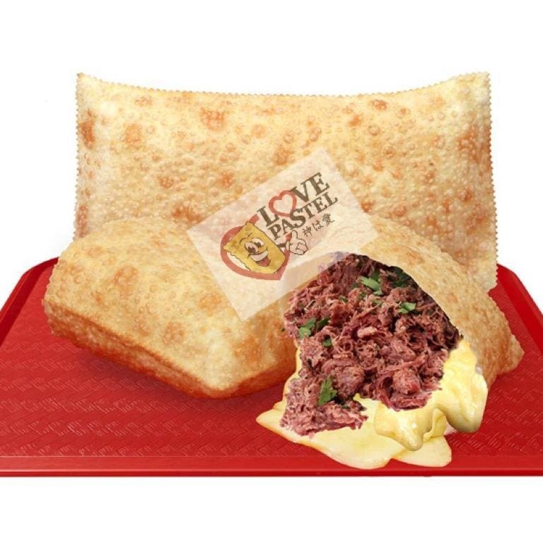 Pastel de carne seca desalgada e desfiada e temperada no alho com queijo mussarela.