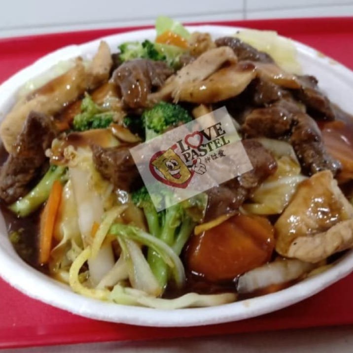 Delicioso Yakisoba de frango e carne, com macarrão, cenoura, repolho, acelga e brócolis refogado