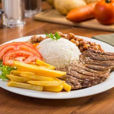 Bife de contra file bem temperado alho chimichurri arroz feijao batata frita
