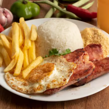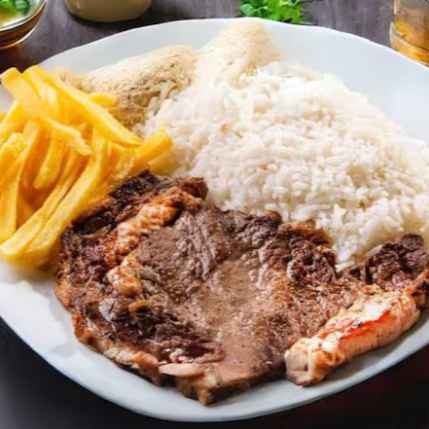 Bife de contra file bem temperado alho chimichurri arroz feijao batata frita