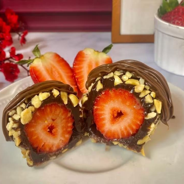 Morango fresquinho envolto em brigadeiro, empanado no amendoim crocante e finalizado com uma generosa camada de Nutella.