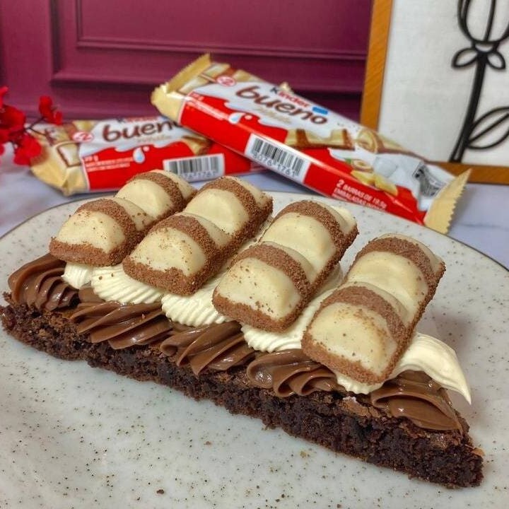 Brownie macio com cobertura de creme de chocolate, creme de Ninho e pedaços de Kinder Bueno. Uma combinação irresistível, feita para quem ama muito chocolate!