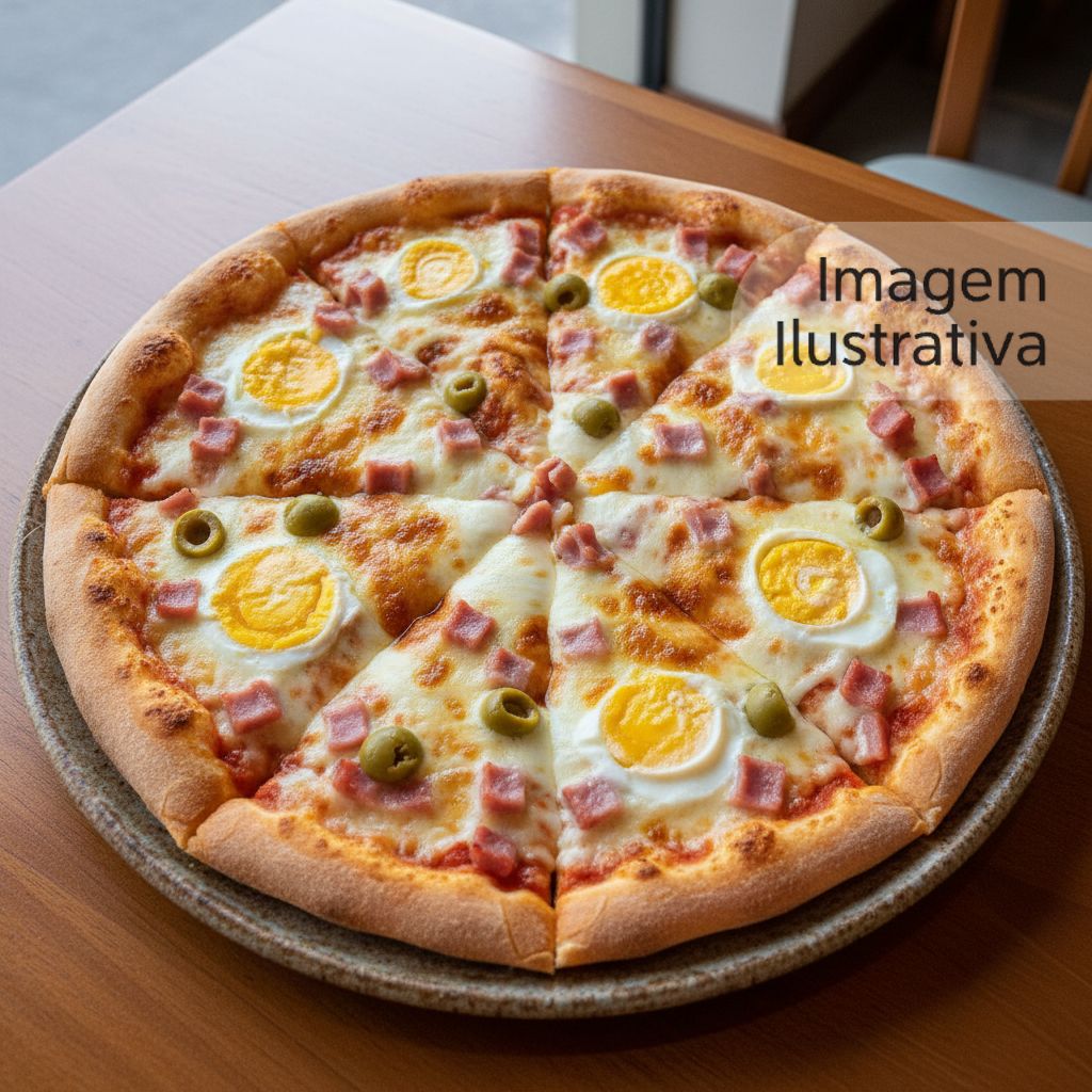 Mussarela derretida sobre molho de tomate, com presunto, ovos, cebola e ervilhas, finalizada com orégano e azeitonas verdes, assada no forno para um sabor marcante e tradicional.