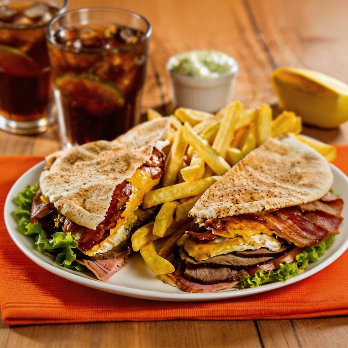 Desfrute do nosso beirute artesanal recheado com bacon, ovo, presunto, queijo, frango, alface e maionese, acompanhado por batatas fritas. Delicioso e satisfatório em cada mordida!