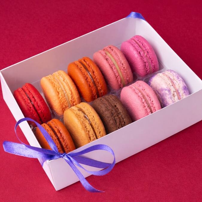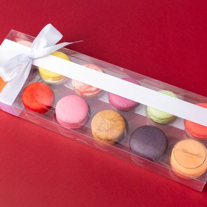 Caixa elegante com fechamento em acetato e fita, contendo 10 macarons selecionados por você, elaborados com receita Original francesa e ingredientes premium.