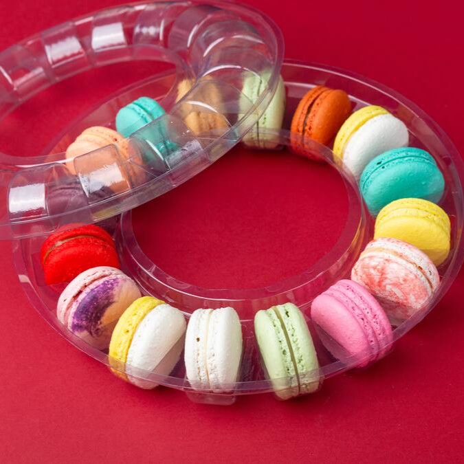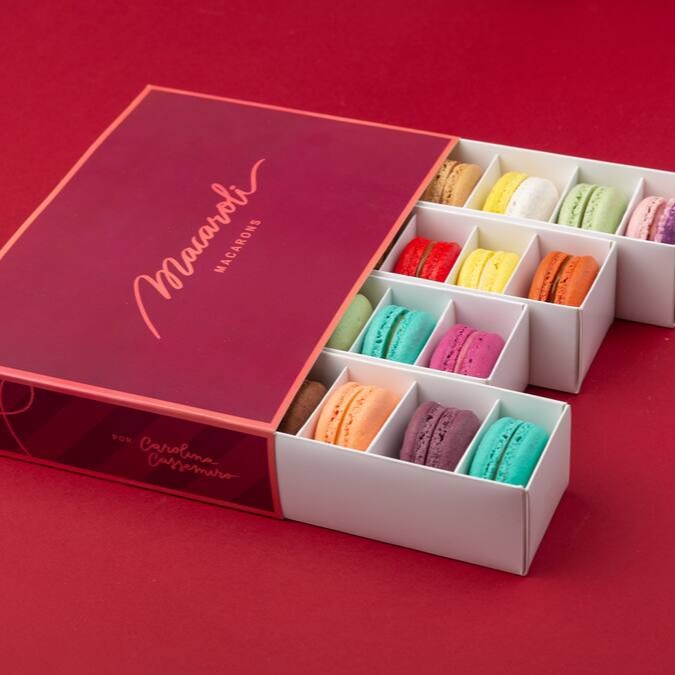 Estojo elegante contendo 15 macarons cuidadosamente selecionados por você, preparados com receita Original francesa e ingredientes premium.