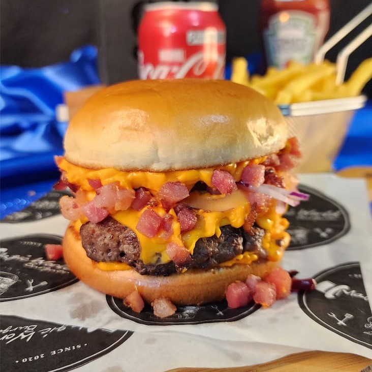 1 Pão de Brioche , Carne de 150 Gramas , Queijo Cheddar , Molho Cheddar , Bacom Em cubo e cebola roxa